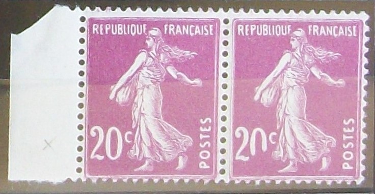 Au début du tirage de cette Semeuse à 20 c. lilas-rose YT n°190 de 1926, on rencontre assez souvent de petits défauts d'impression, avec disparition de certains caractères composant les légendes ou la valeur faciale. Les exemples sont multiples : ces petits caractères étaient en creux sur le cylindre et ne devaient donc pas être encrés. Ils apparaissent normalement en blanc sur les timbres.